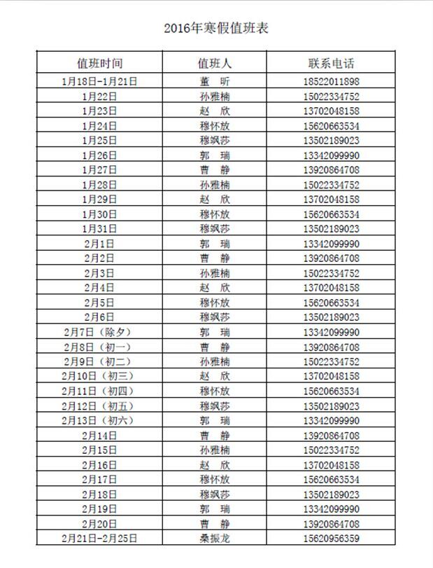 商公司2016年寒假假期就业服务值班表