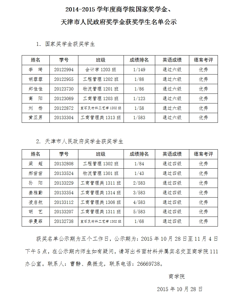 2014-2015学年度商公司国家奖学金、 天津市人民政府奖学金获奖学...