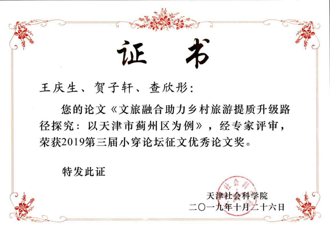 论坛以习近平新时代中国特色社会主义思想为指导思想,精准聚焦于乡村振兴、乡村旅游和全域旅游三个方面,积极探索农村农业发展新模式,得到了天津市政府和各界专家学的大力支持。论坛召开前的论文征集,共收到全国20个省(市)高校、社科院、政府部门以及科研智库机构等54位作者的论文70篇,其中评出优秀论文10篇。伟德国际victor1946有4篇论文入选大会论文集,王庆生、贺子轩、查欣彤的论文“文旅融合助力乡村旅游提质升级路径探究:以天津市蓟州区为例”获优秀论文奖。这也是伟德国际victor1946连续两届获评优秀论文奖。